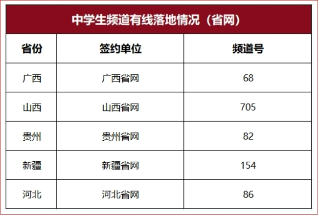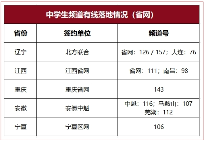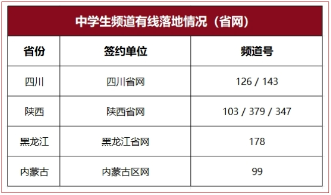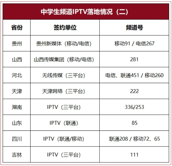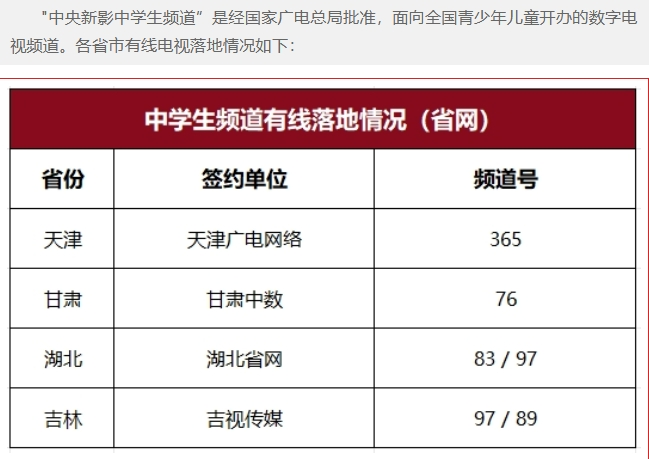 中央新影中学生频道、CCTV手机电视、央视频、咪咕视频、手机电视高清频道、IPTV电视机顶盒等。