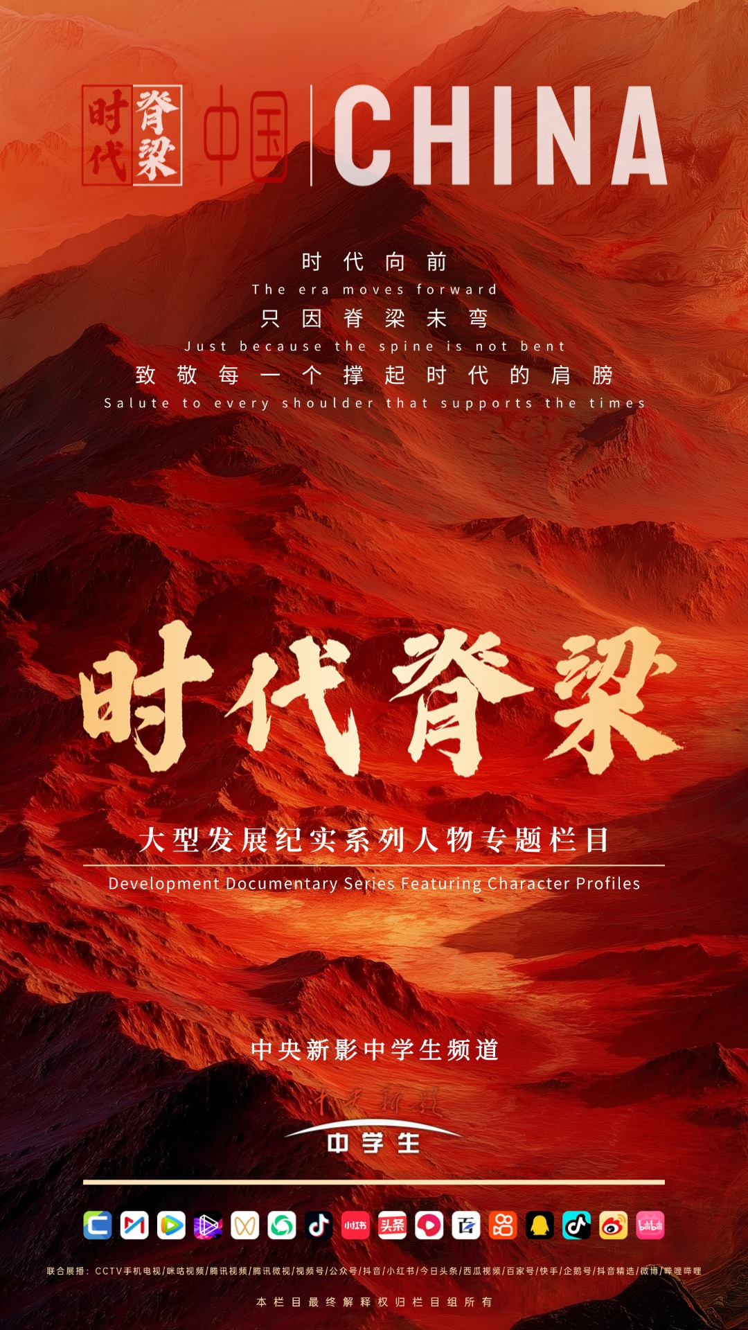 中央新影中学生频道《时代脊梁》栏目是聚焦中国发展进程的大型纪实系列人物专题栏目,以 “记录时代印记,传递精神力量,为中国发展进程中的杰出人物立传” 为核心宗旨,依托国家级传播平台的公信力与影响力,为推动国家进步的时代标杆人物,提供权威品牌认证与全国性传播支持。栏目深耕中国发展的关键领域与重要节点,遴选在科技创新、产业革新、文化传承、民生改善、社会担当等领域作出突出贡献的杰出人物、引领产业升级的企业家,通过纪实镜头追溯人物成长轨迹,挖掘其在困境中坚守、探索中突破的奋斗故事,还原与时代同频共振的人生历程,让“时代印记”可感可见,让“脊梁精神”具象可触。