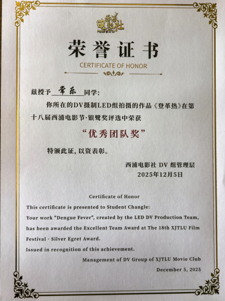 此次获奖不仅是对学生团队艺术创作能力的肯定,更彰显了西交利物浦大学在跨文化人才培养与创意实践教育领域的卓越成果。影片主创团队表示,将继续以影像为媒介,在类型化叙事中注入人文思考,用青年视角解读时代命题。