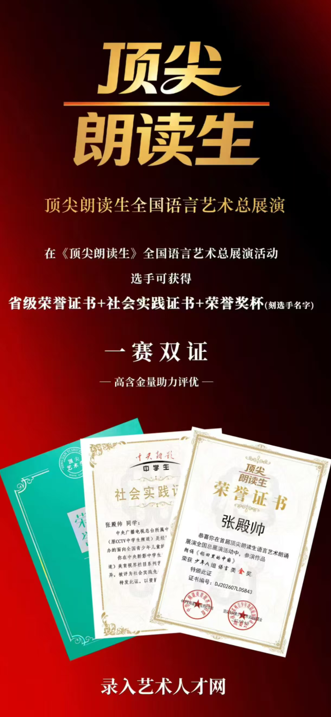 近期,我们发现市面上出现了一个名为“顶尖朗读生”的活动,该活动在宣传物料中提及到的社会实践证书发放,且证书上印有中央新影中学生频道的 logo。在此,中央新影中学生频道郑重声明: