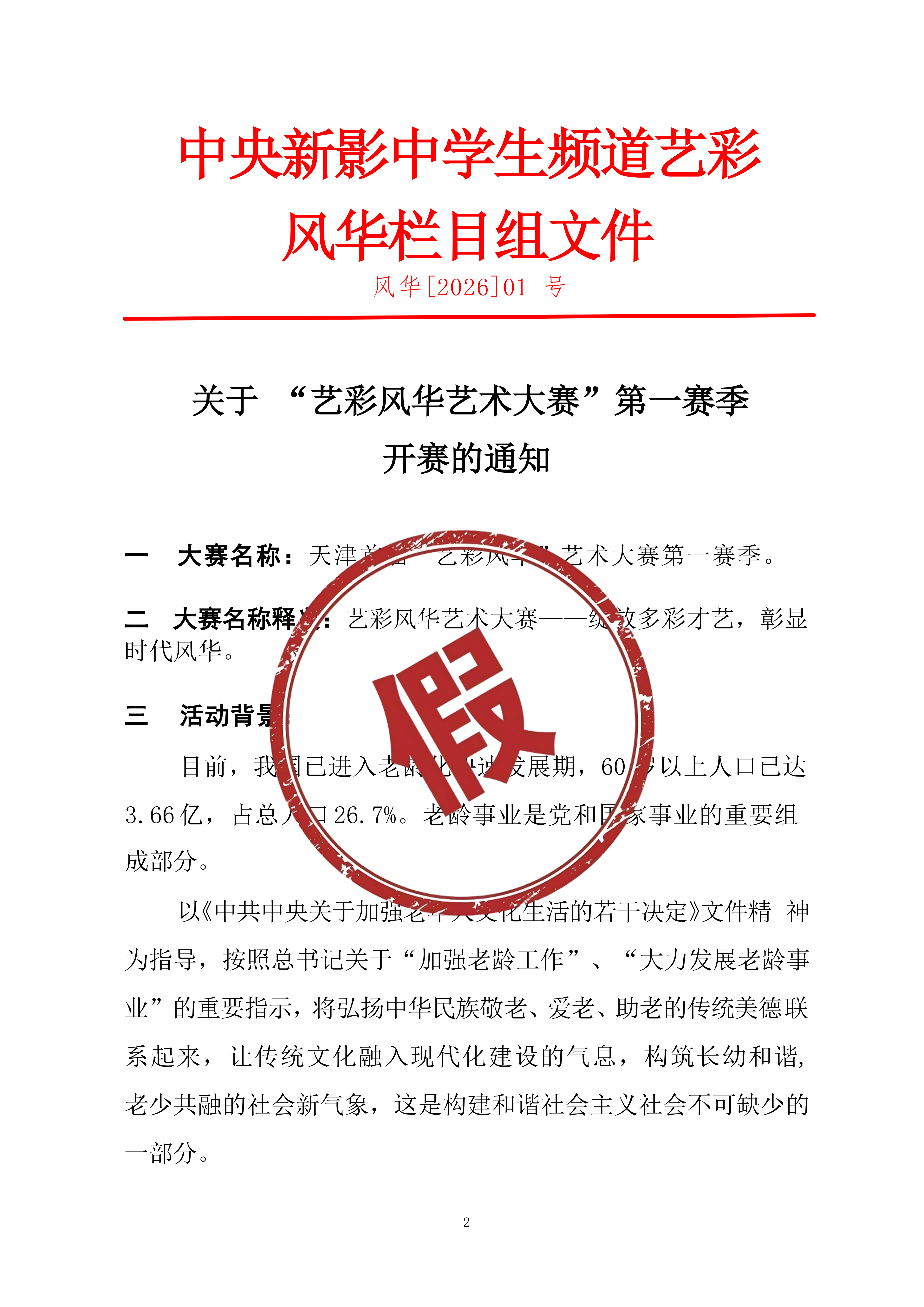 近期,我频道舆情监测部门在开展舆情监测工作时,发现一则关于《艺彩风华》栏目组开展“艺彩风华艺术大赛”的宣传内容。经核查,中央新影中学生频道在此郑重澄清: